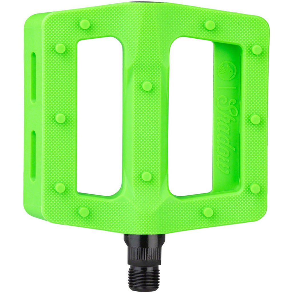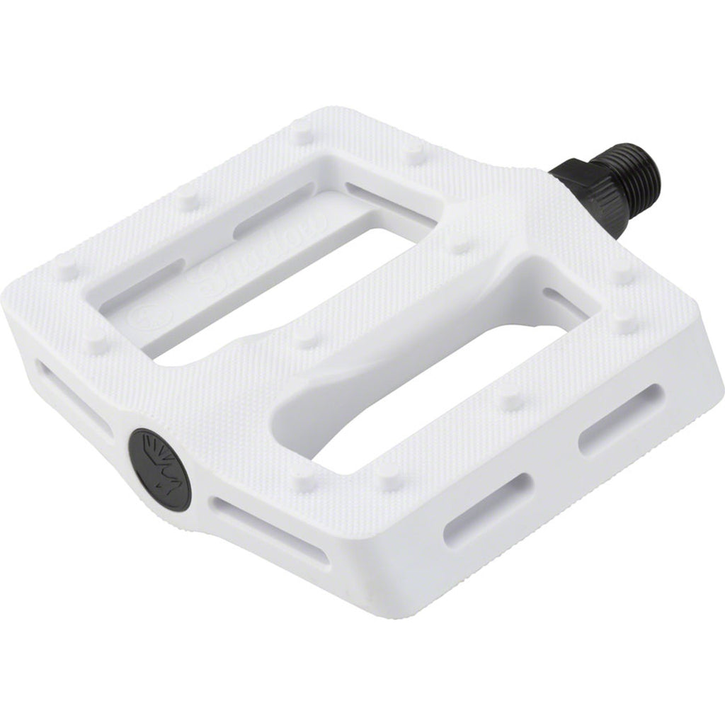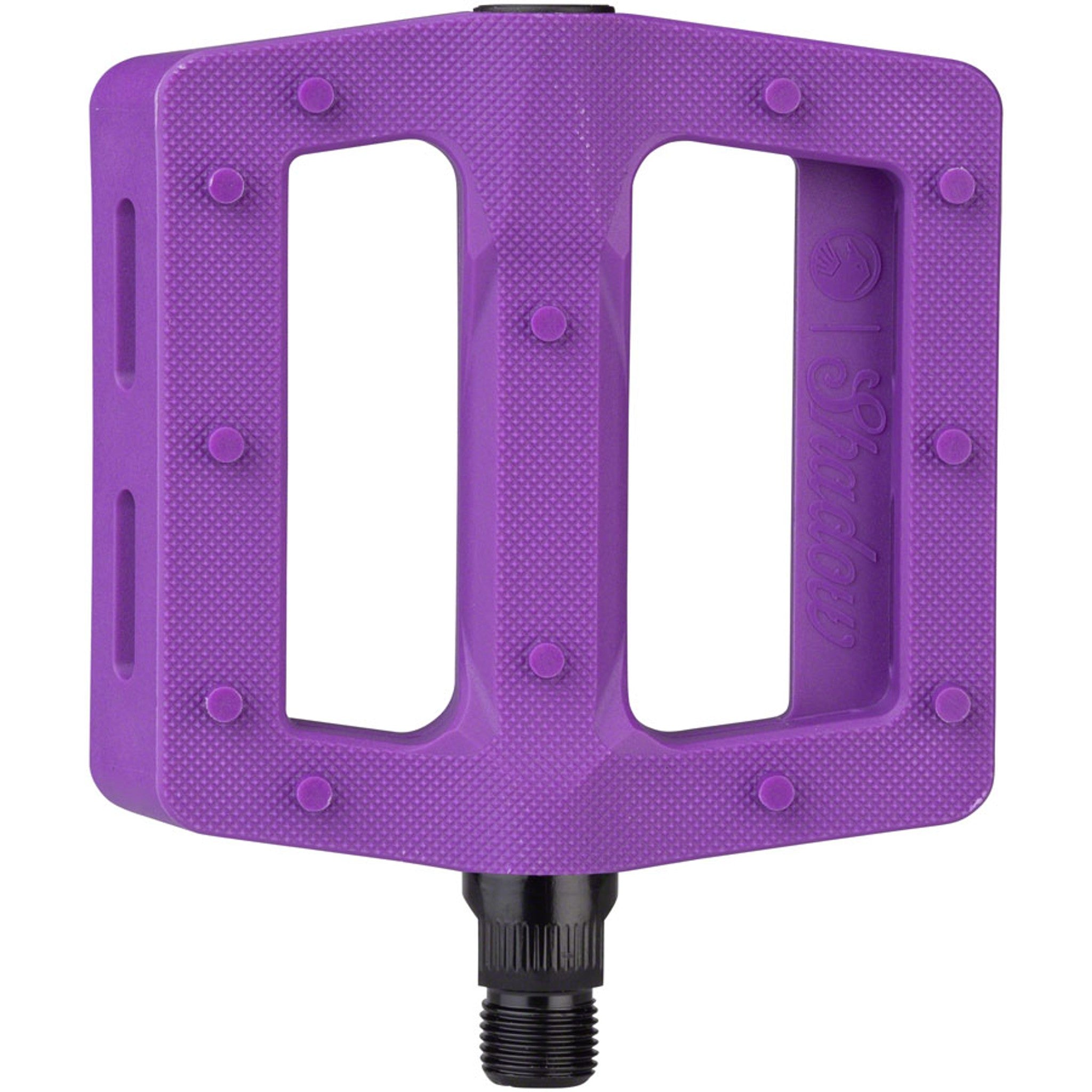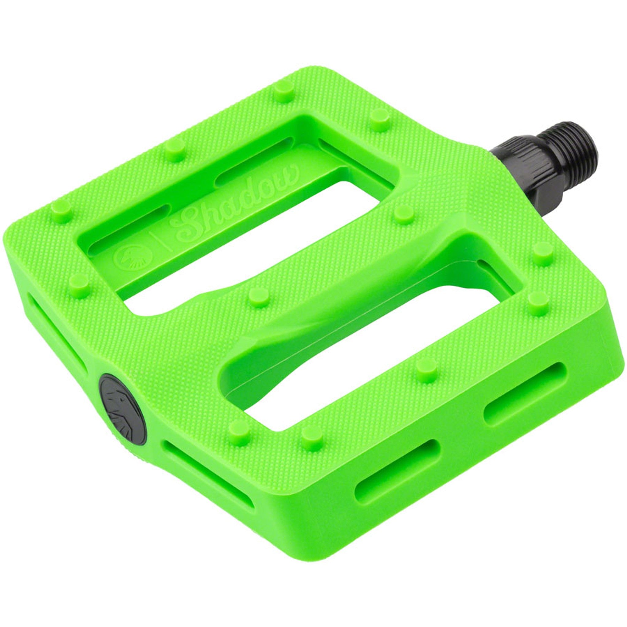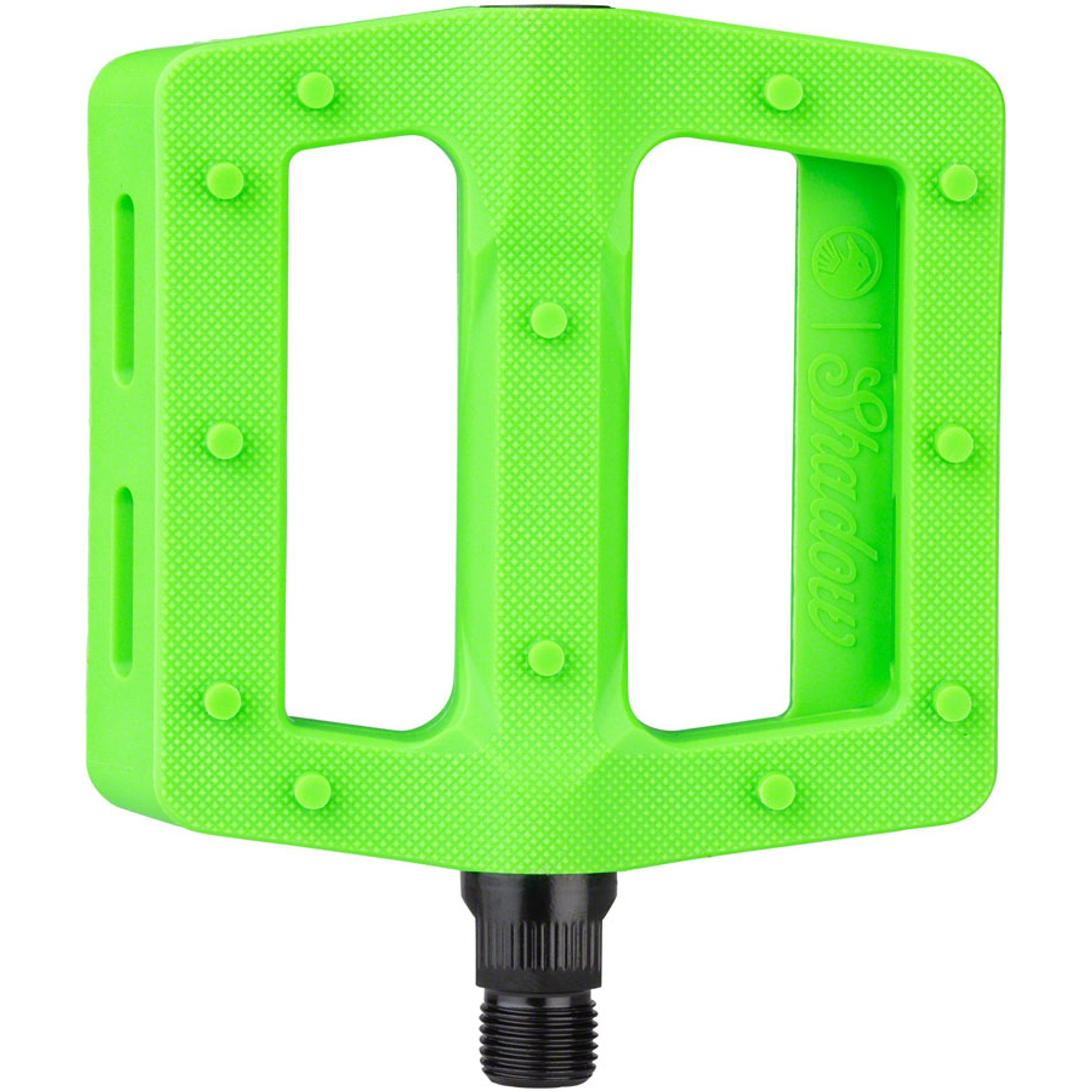 The new Shadow Surface Pedal is made with performance and function in mind. Starting with a wider and longer, slim platform. The wide 105mm x100mm platform is specifically shaped to be thin and stiff while still offering an overall concave shape.Added advanced micro knurling and 12 pins per side for a maximum grip that still allows foot adjustments mid-shred. Made with the same proven nylon composite material as the Ravager pedal, with a heat treated chromoly axle that includes a 6mm broach for ease of installation and high end looks.